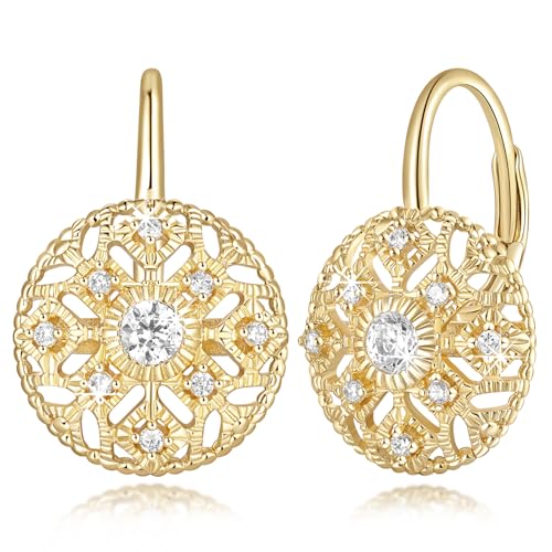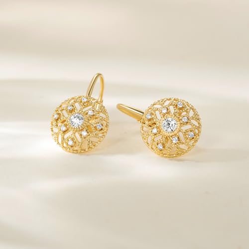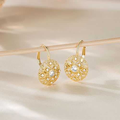 Eloqueen 14K Gold Drop Earrings Dangle Earrings for Women Leverback Dangle with Cubic Zirconia with Engraved Details 14K Gold Earring for Women
